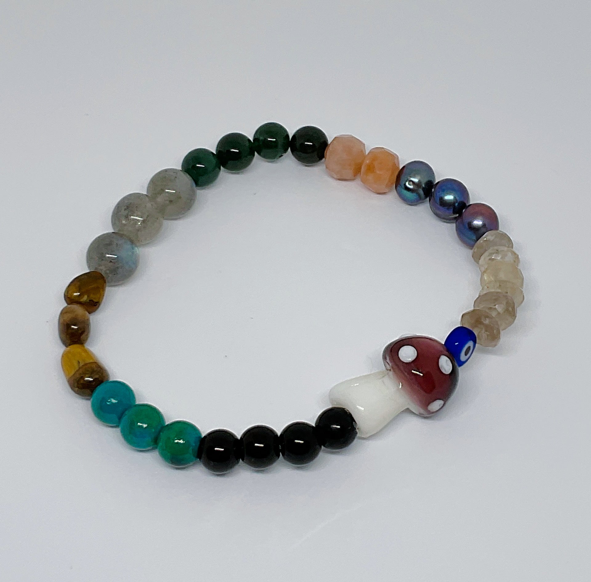Rose Quartz, Charoite, Smoky Quartz, Moonstone, Selenite, Hematite, Citrine, Rutilated Quartz, Carnelian, Sapphire, Emerald, Mushroom Bead, Tigers Eye, Aquamarine, Amazonite, Pearl, Blue Lace Agate, Flourite, Black Pearl, Kunzite, Tourmaline, Morganite, Apatite, Chrysocholla, Smoky Quartz, Epidote, Peridot, Amethyst, Evil Eye Charm, Labradorite